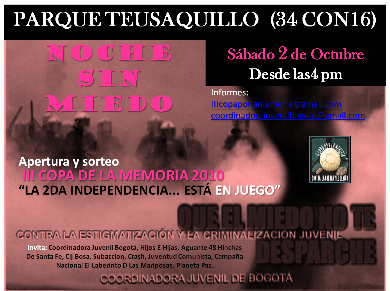 Invita: coordinadora juvenil Bogotá, hijos e hijas, aguante 48 hinchas de santa fe, CLJ Bosa, Subacción, Crash, Juventud Comunista, Campaña Nacional el Laberinto de las Mariposas, Planeta Paz.