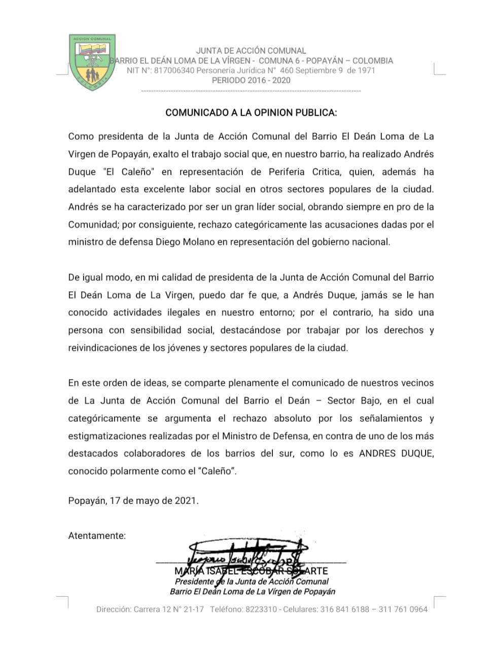 JAC Barrio El Deán Loma de la Virgen Comuna 6 de Popayán - Comunicado a la Opinión Pública